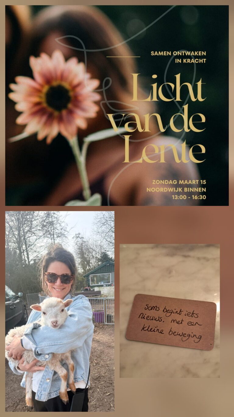 Afgelopen weekend gaf ik me in het kader van zelfzorg en zelfliefde op voor een hele mooie bijeenkomst van Hartbrein (NLP, familieopstellingen, die mij door een prachtige opstelling heen leidde) i.s.m. Coaching by 10 (mijn rots in de branding de afgelopen tijd en liefdevolle coach, die ik iedereen kan aanraden!). Met een groep vol powervrouwen volgden wij een coaching sessie met als thema ‘Licht van de lente’. Wat een bijzondere ontmoetingen, waaruit direct al bleek dat we met een reden op elkaars pad waren gekomen en we bevestigd kregen: Toeval bestaat niet, met zoveel overlap in thema’s. Bijzonder hoe iedereen zich veilig voelde, opende en deelde, maar vooral, om te zien hoe krachtig vrouwen kunnen zijn in al hun zachtheid en hoe we als we die krachten bundelen, elkaar kunnen dragen. Dat dat fysieke pijn weg kan nemen, omdat je niet meer alleen staat, ervaart dat je mag leunen en inzicht krijgt in jouw systeem, vond ik in het moment in mijn opstelling al bevrijdend, maar vandaag voelde ik zoveel ruimte, in mijn nek, mijn schouders, mijn hals en keel en had ik zelfs na weken geen pijn meer.