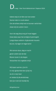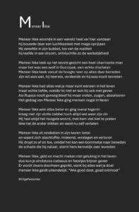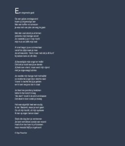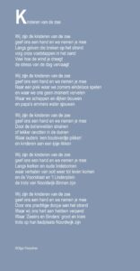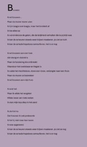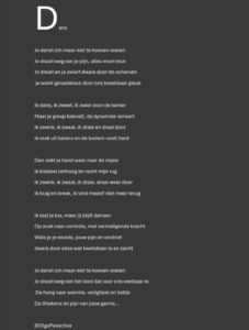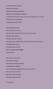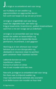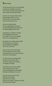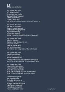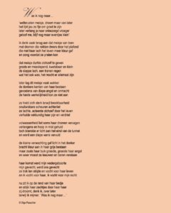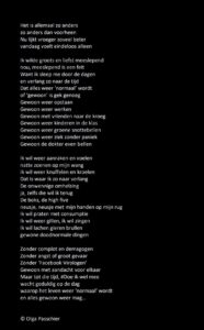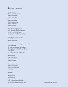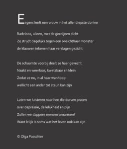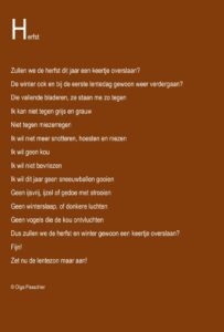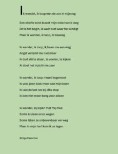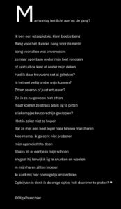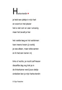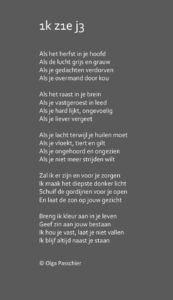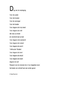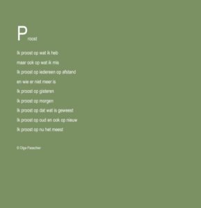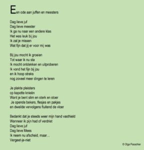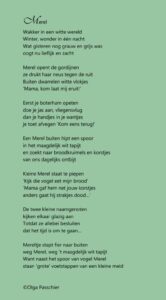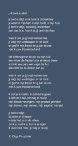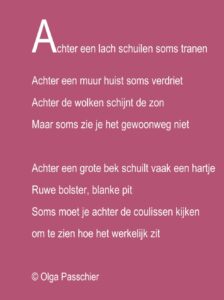 Gedichten & Liedteksten All Dans De weg Bankverlangen Merel Tekst Olga Passchier Muziek Laura de Bekker Anders Tekst Olga Passchier Muziek Laura de Bekker Arrangement: Hans Cassa Was ik nog maar Kinderen van de zee Tekst Olga Passchier Muziek Henk Ruiter Jij bent er altijd Tekst & Muziek Olga Passchier Depressie Je krijgt er zo ontzettend veel voor terug Coulissen Beetje blauw Little blue Jacob Collier Herfst Ongenode gast Hartsvriendin Vrijheid Dag lieve juf Dag lieve meester Goud Dag van de verpleging Frederique 1k z1e j3 Proost Oma Klaartje Mijn man die alles kan Fietsen Ik wandel Tekst & muziek: Olga Passchier Mama mag het licht aan op de gang? Meneer Ikke Ik wil bouwen Ik wil bouwen 2